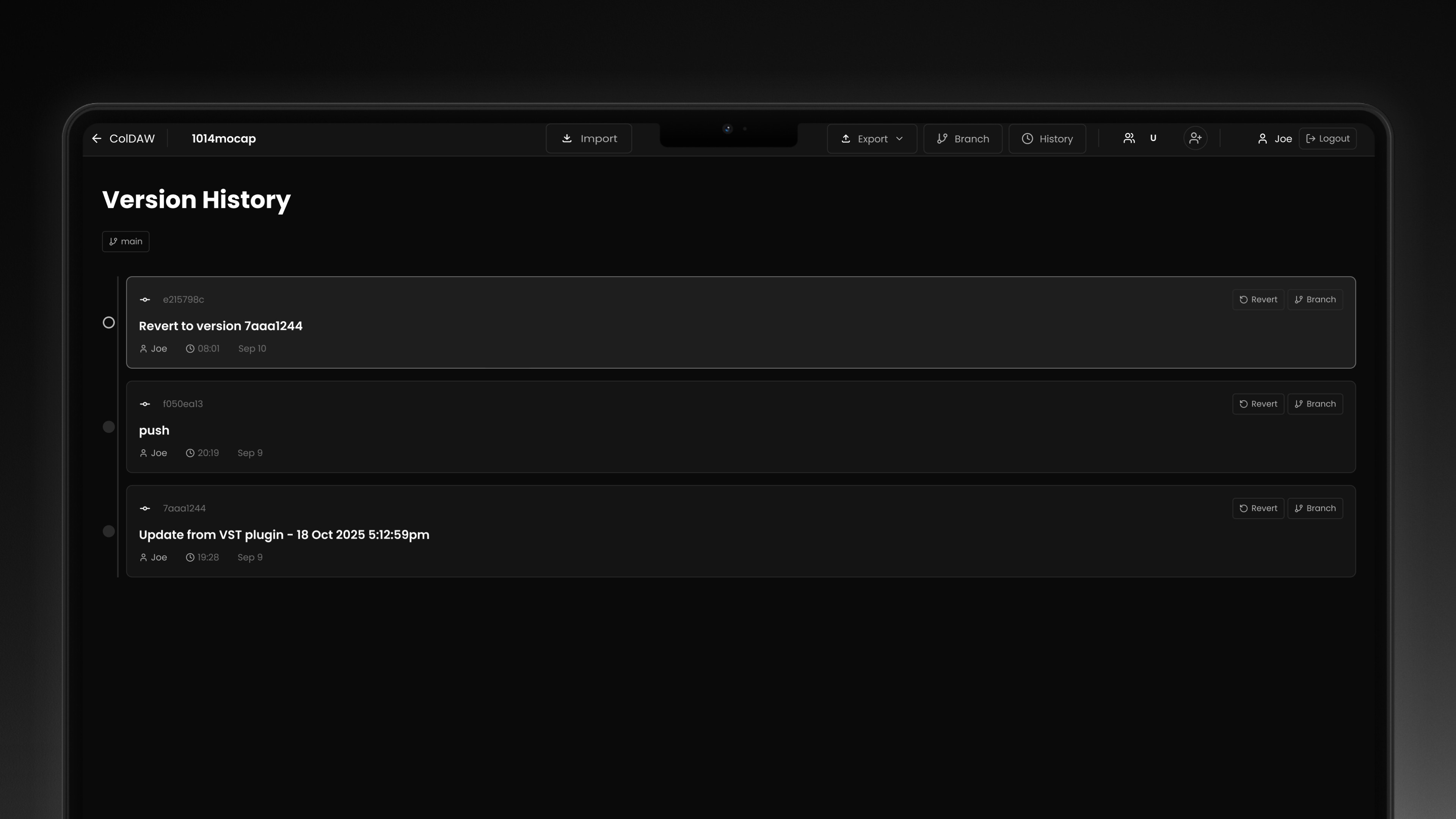 ColDAW is designed around interaction patterns that professional DAW users already understand. The interface mirrors established DAW concepts such as tracks, timelines, clips, and project states, allowing creators to navigate, review, and modify projects without learning a new mental model.