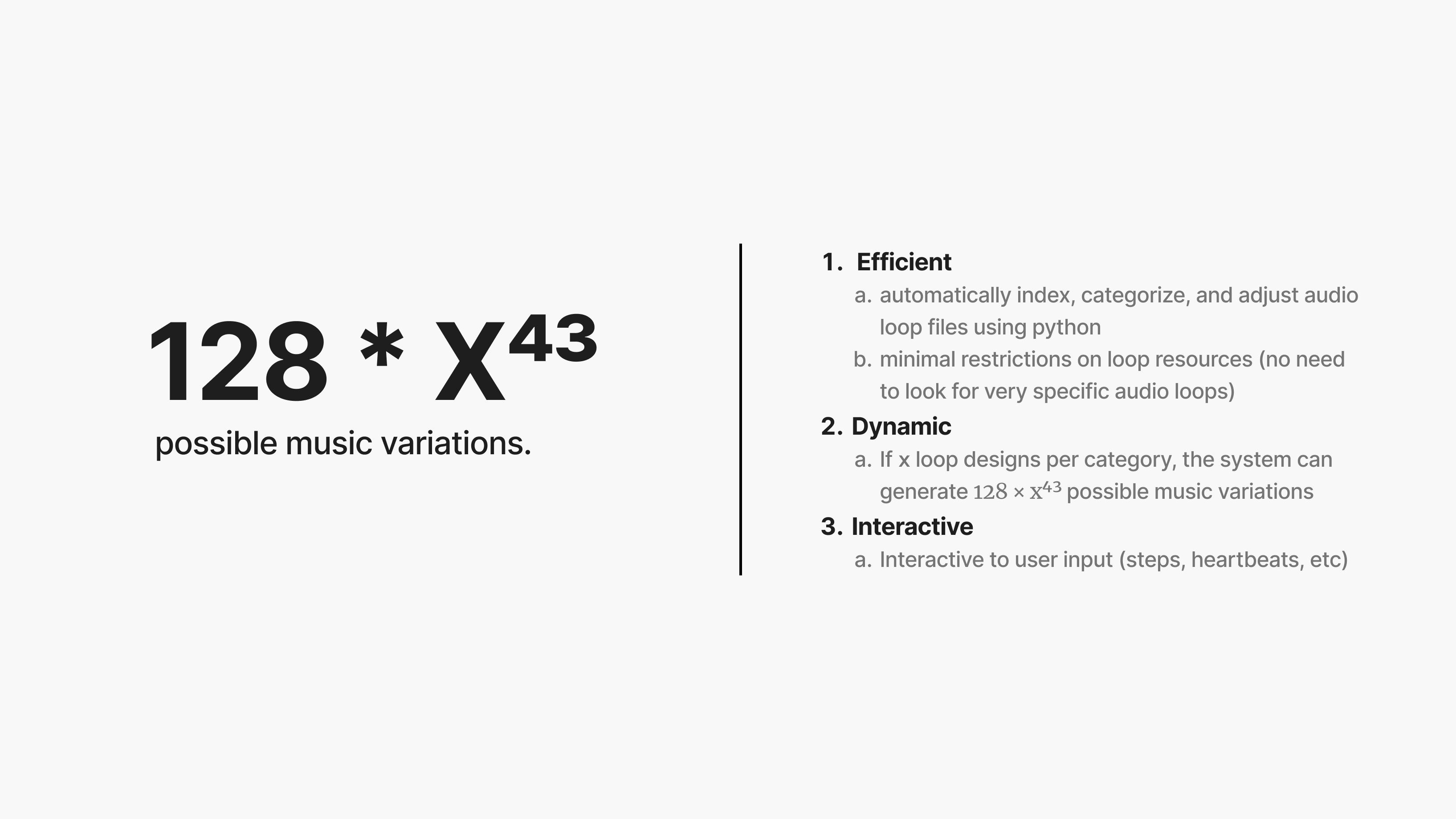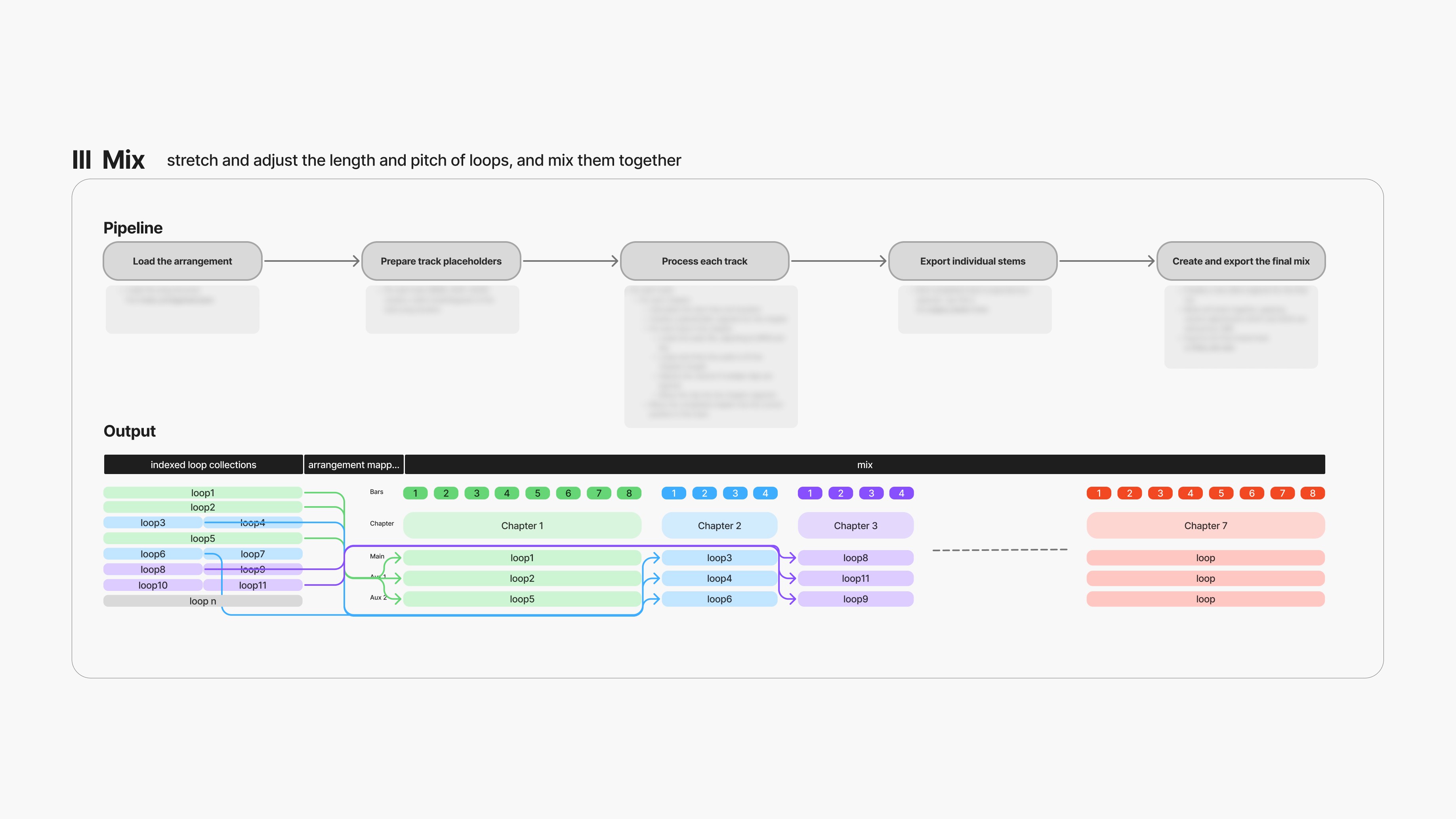 Once arranged, selected loops are automatically aligned in tempo and pitch, then mixed together into a coherent musical output. Time-stretching and pitch adjustment ensure rhythmic and harmonic consistency, while predefined mixing rules maintain balance across musical elements. This stage translates abstract structure into continuous audio.