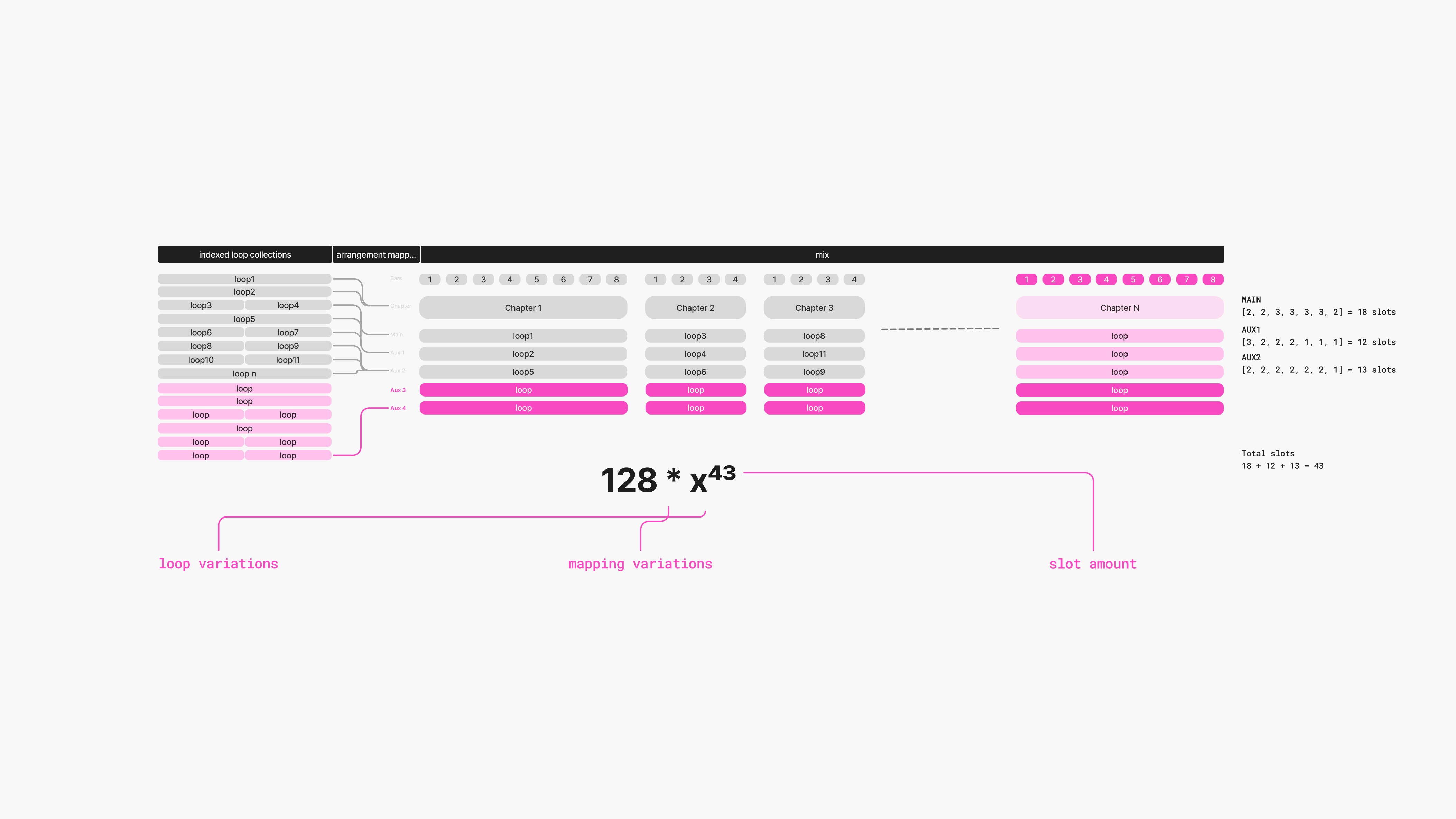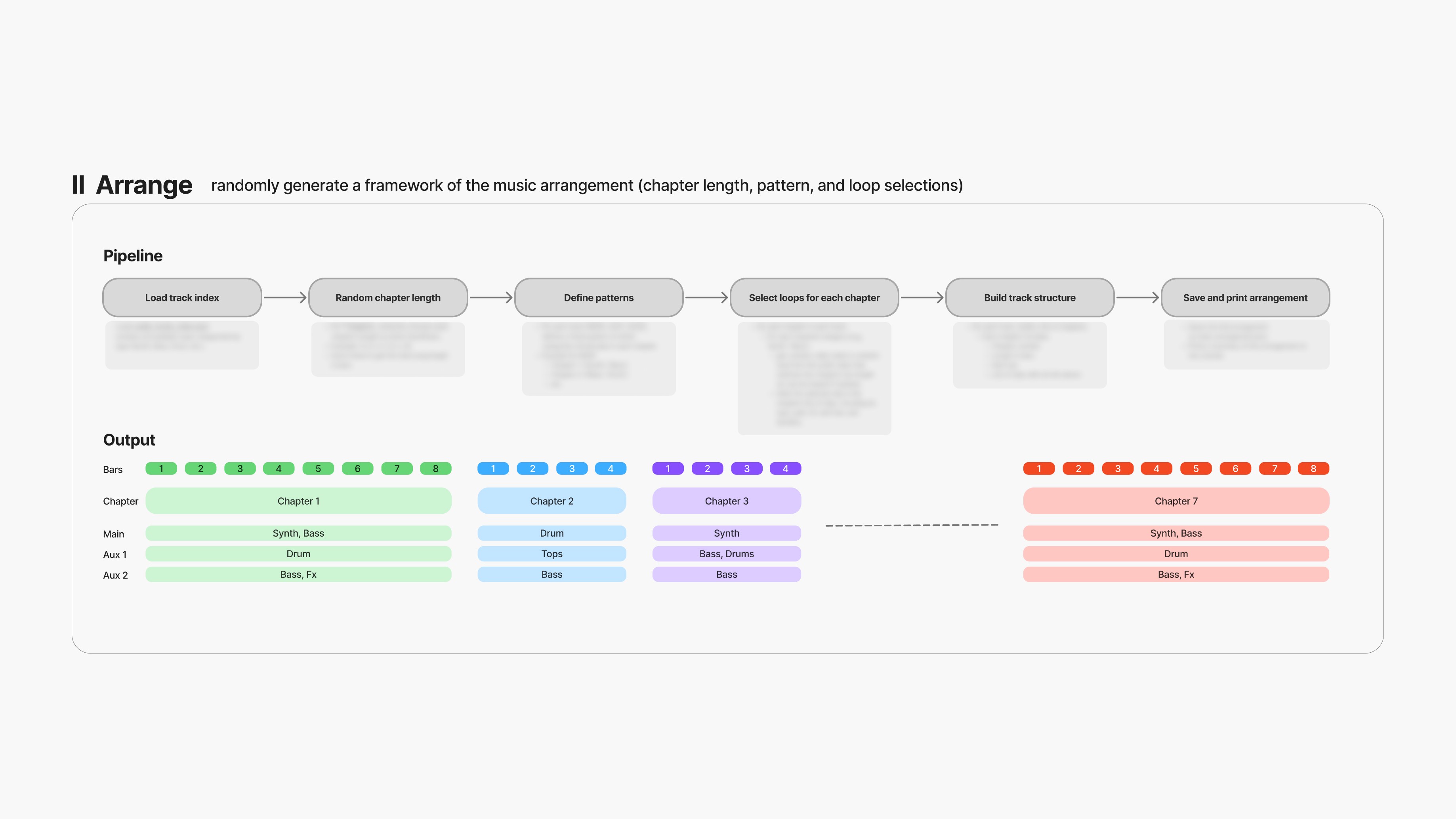 Using the indexed data, the system generates a high-level musical framework composed of chapters, sections, and patterns. Loop selection and placement are algorithmically determined within defined constraints, balancing randomness with musical logic.