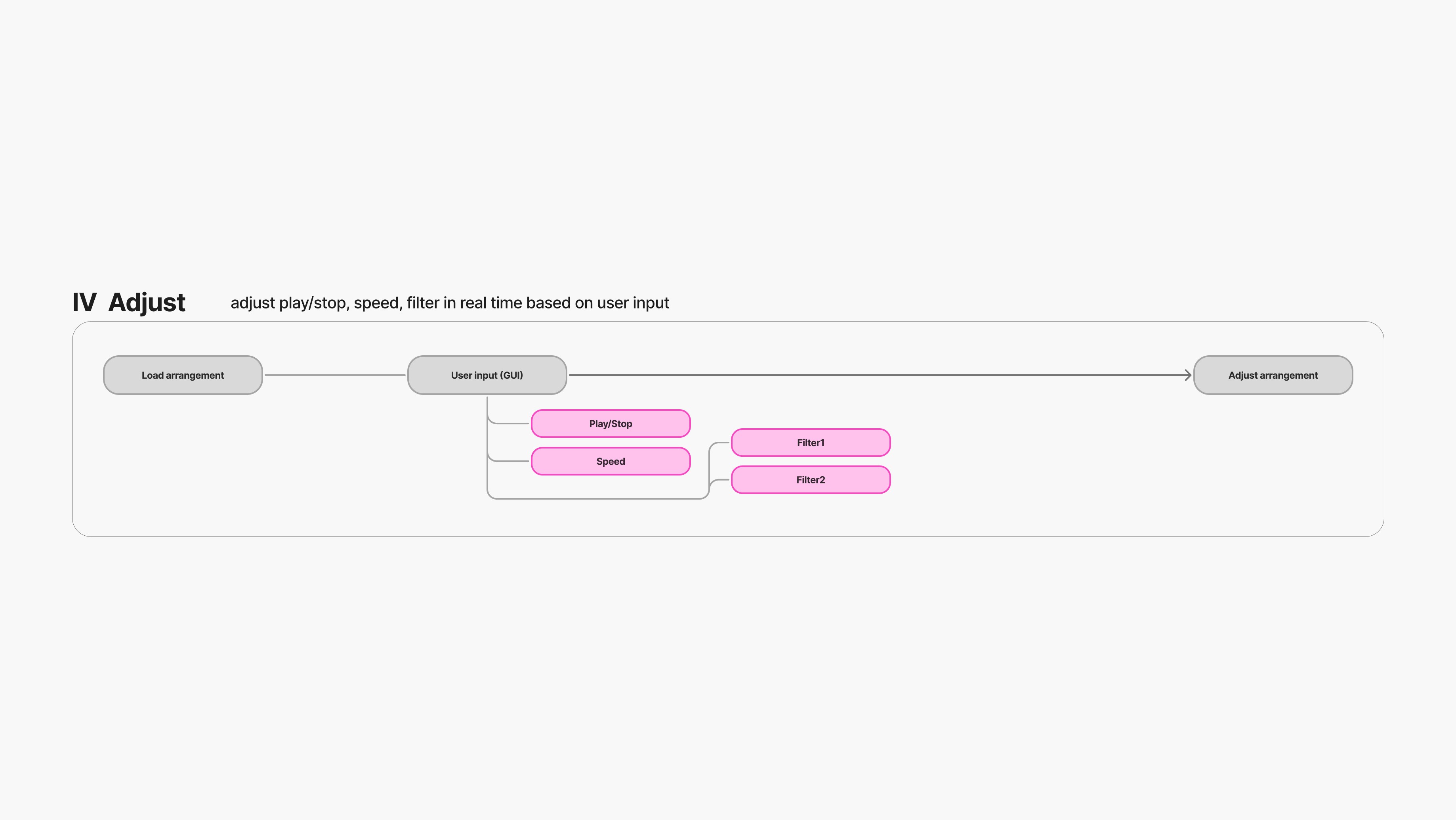 In the final stage, the system allows real-time or rule-based adjustments based on user input or contextual needs. Parameters such as playback speed, filters, and arrangement density can be modified without regenerating the entire piece.