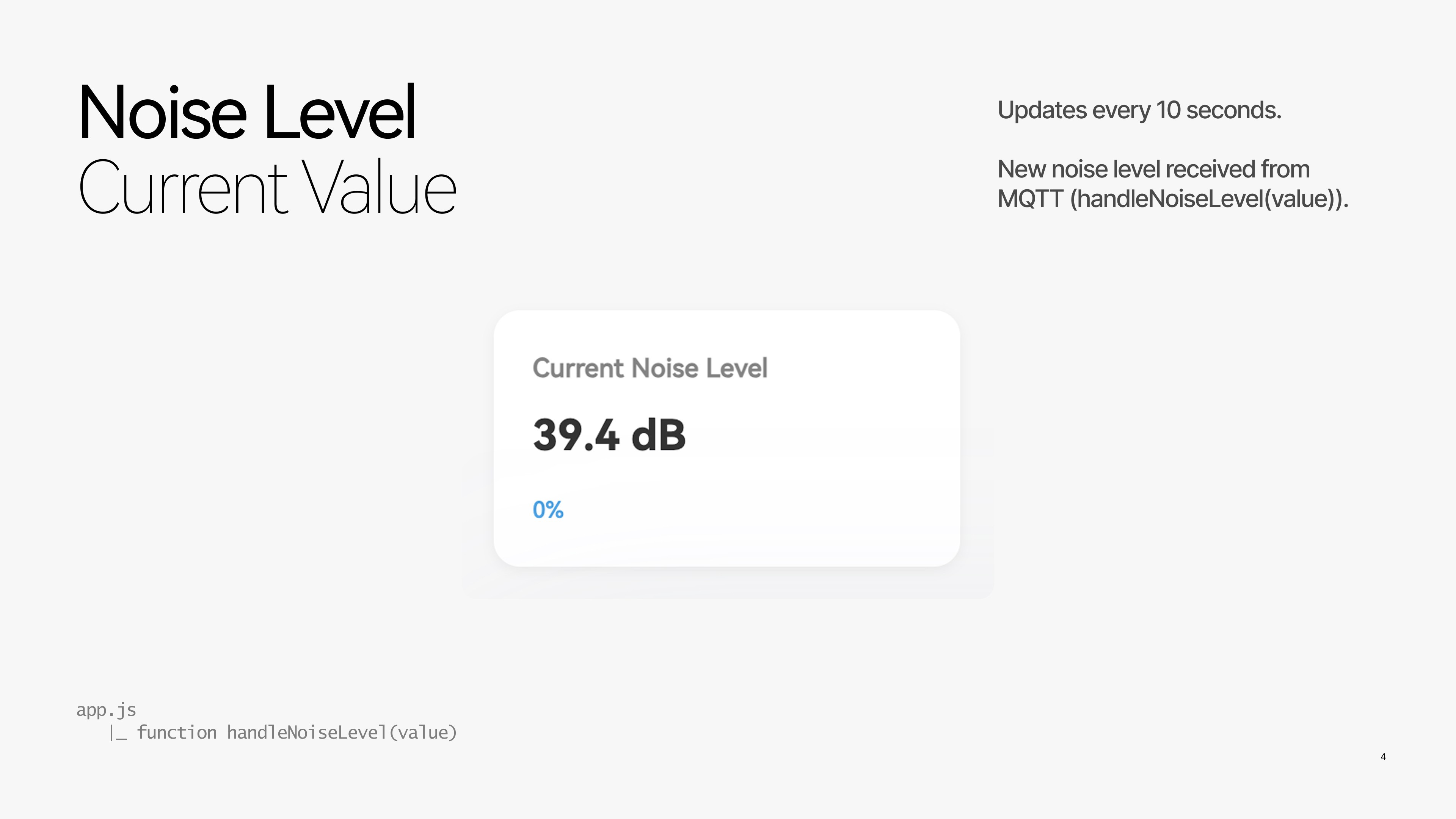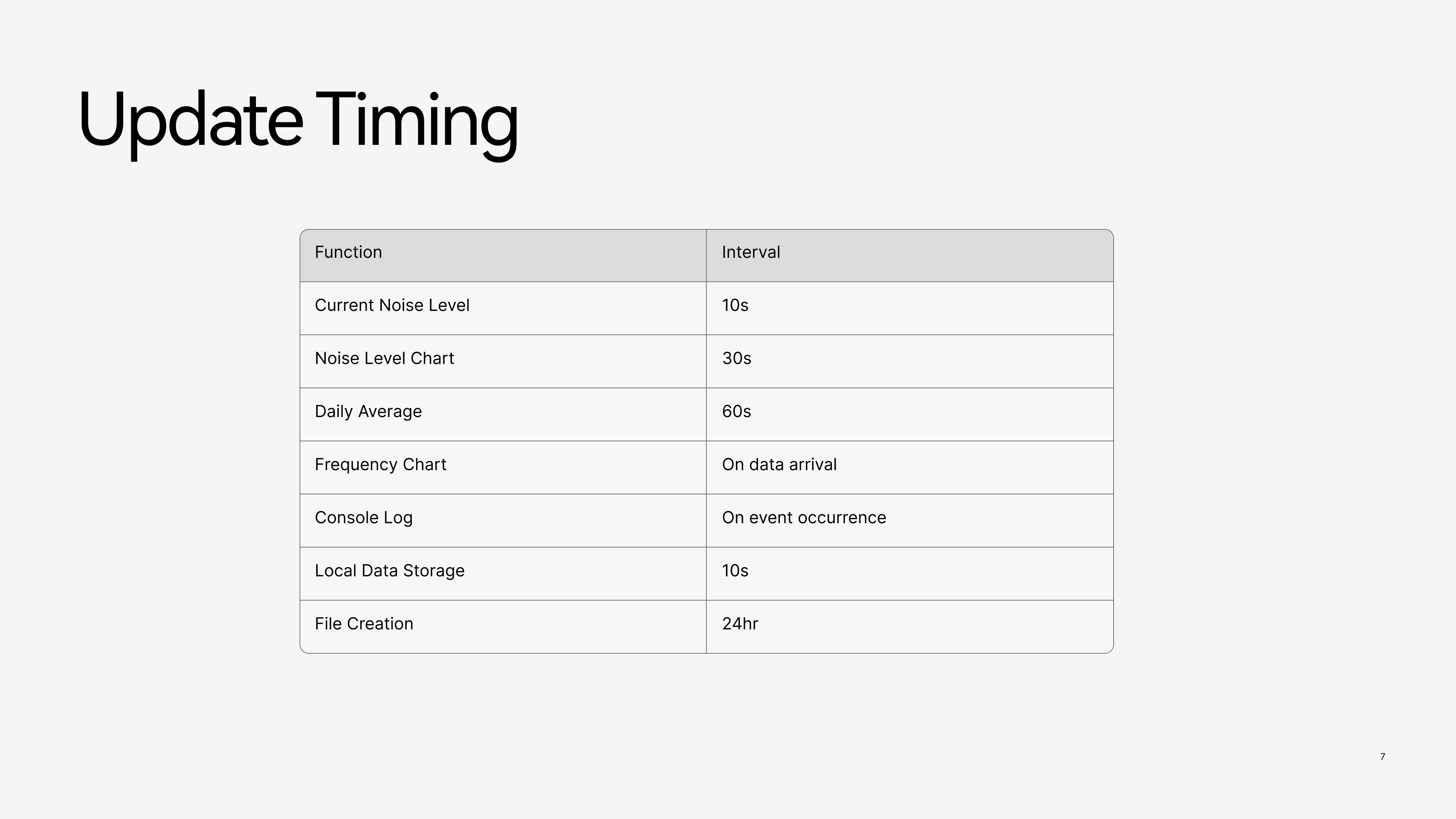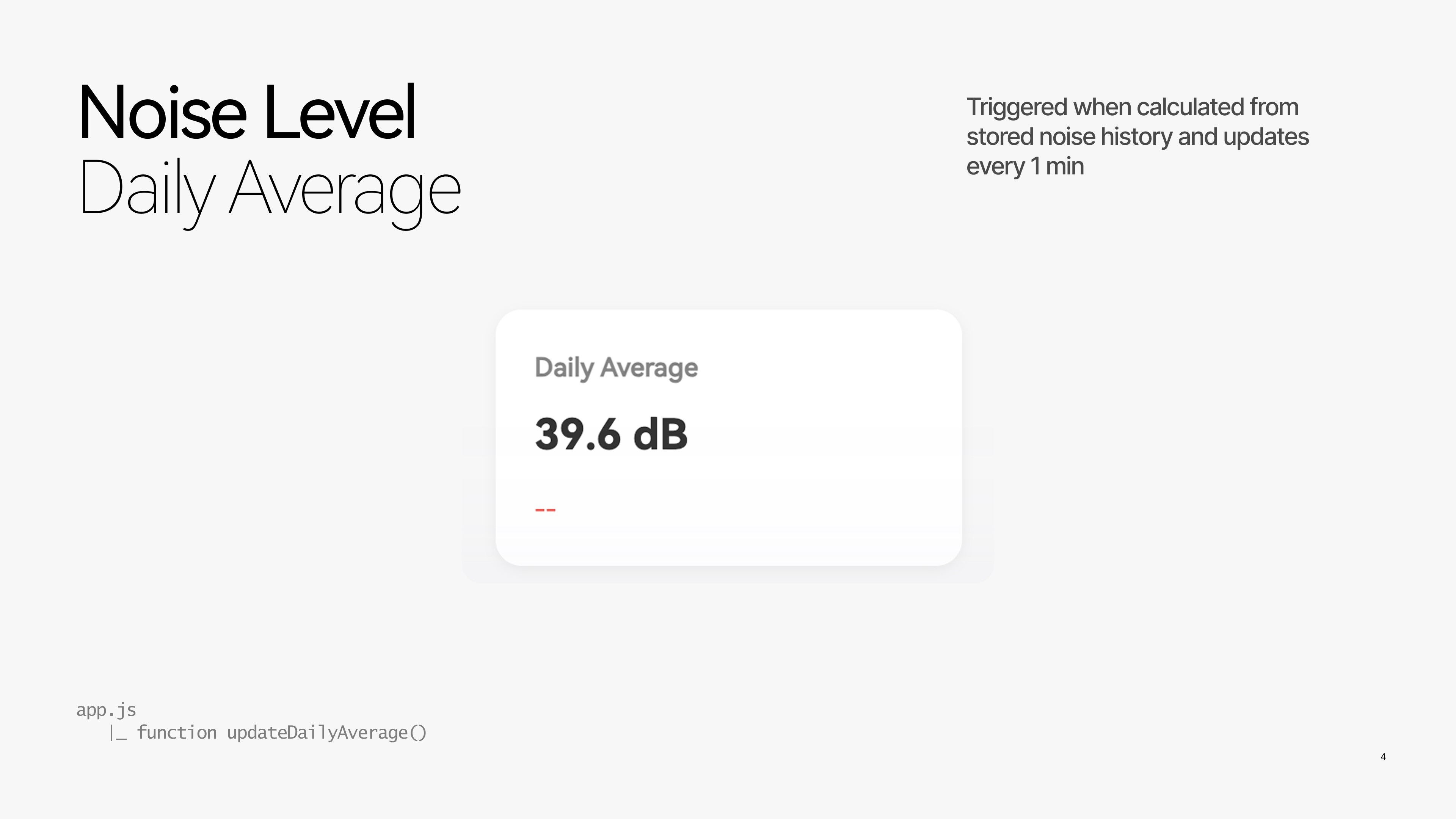 To support calm awareness, different types of information update at different rhythms. Current noise levels refresh at short intervals to provide glanceable feedback, while charts and daily averages update more slowly to emphasize patterns over spikes. This timing strategy prevents visual overload and aligns with how users naturally interpret environmental change.