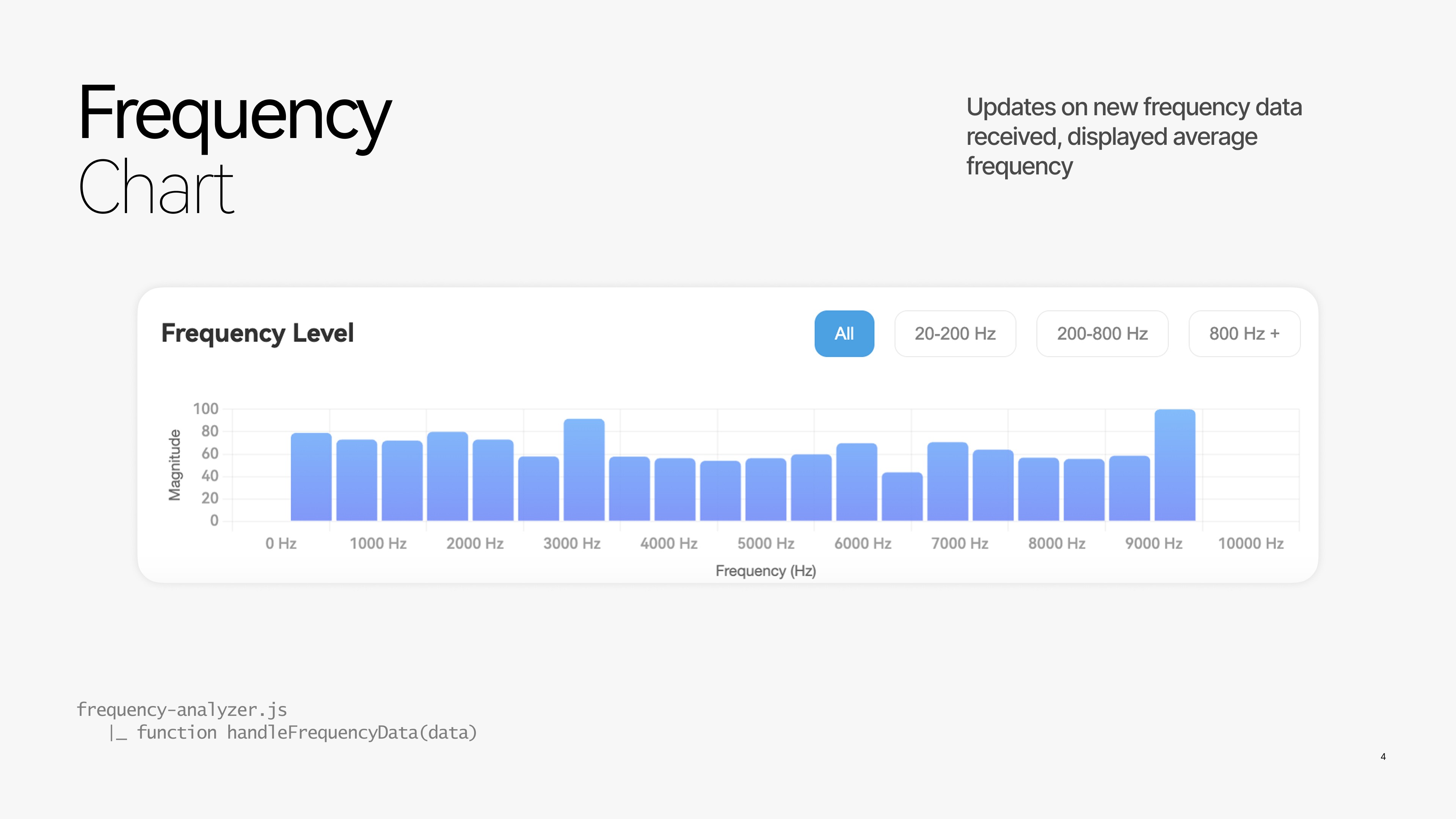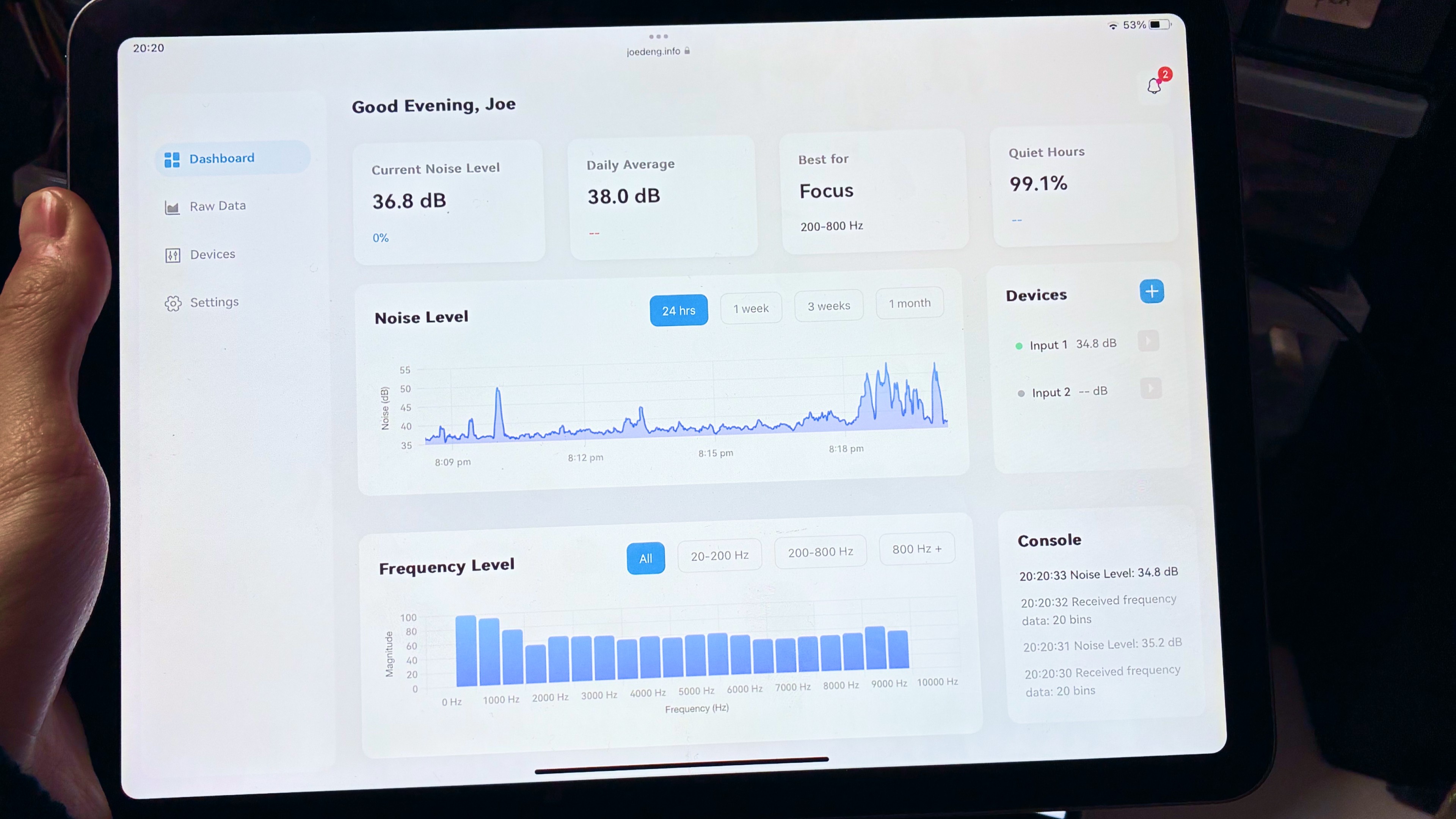 Noise data is presented at multiple levels of abstraction. A single-value noise indicator offers immediate context, while time-series charts reveal longer-term trends. Frequency data is visualized as a secondary layer, updated only when new spectral information arrives, allowing users to explore the acoustic character of a space without forcing continuous attention.
