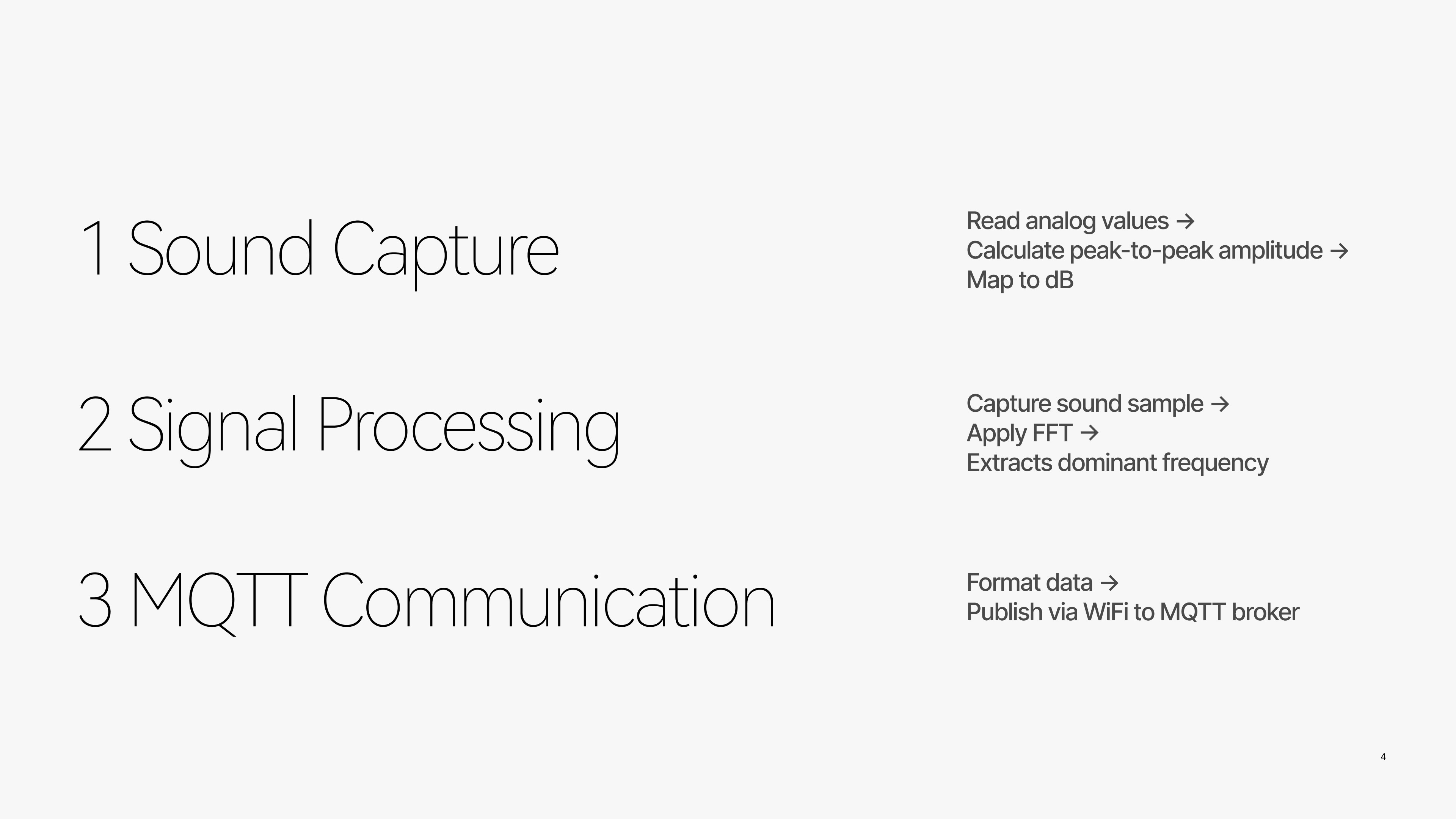 The system is structured as a layered pipeline that separates sound capture, signal processing, and visualization. Environmental audio is continuously sampled through a microphone module and processed on the microcontroller, where raw analog values are converted into sound pressure levels and frequency-domain data. Rather than pushing every fluctuation to the interface, the system deliberately filters and batches data, reducing noise both computationally and perceptually.
