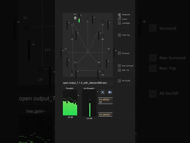 The final piece was rendered in multiple formats: 7.1.2 for the Audio Lab’s speaker system, binaural for headphone listening, and stereo for documentation and portability. This ensured consistency across playback contexts while preserving the core spatial intent of the work. Below is a series of MaxMSP visualizations of the multichannel format: